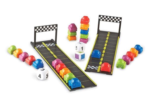 Deze kleurrijke auto activiteitenset ontwikkelt een verscheidenheid aan wiskundige vaardigheden. Naast getalherkenning (1-20) kan ook het tellen, optellen, patroonherkenning en kleurherkenning gestimuleerd worden. De kinderen gooien met de cijferdobbelsteen en gaan het respectievelijk aantal vakjes vooruit. Wie kan als eerste de finishlijn bereiken?