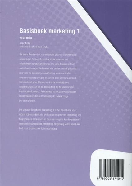 Titel: Basisboek marketing Voor mbo Auteur: Inge Berg ISBN: 9789006871012 Conditie: Used De serie rendement is ontwikkeld voor de commerciele opleidingen binnen de sector economie van het middelbaar beroepsonderwijs. Kenmerkend is de duidelijke en heldere structuur en de aansluiting bij de vernieuwde kwalificatiedossiers. Basisboek Marketing 1 is het basisboek voor iedere mbo-student.