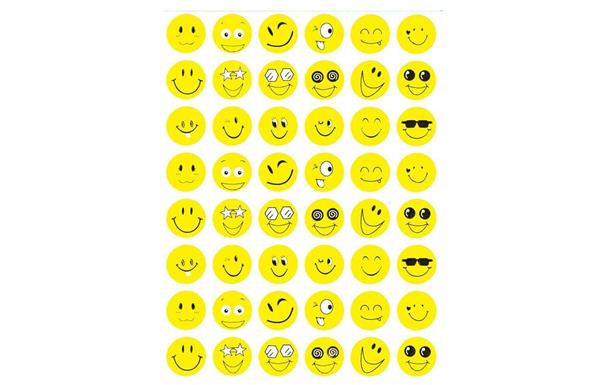 6 vellen met telkens 48 stickers met gekke gezichten in het geel. Ideaal als beloningsstickers.
