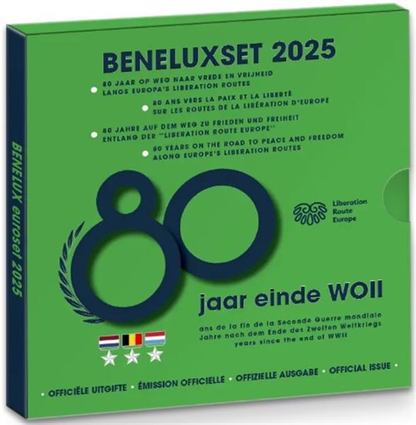 Benelux BU 2025. De Beneluxset 2025 heeft als thema: 80 Jaar einde Tweede Wereldoorlog! 5 mei 1945 was een belangrijke dag in de Nederlandse geschiedenis. Het betekende het einde van de 2e Wereld Oorlog en Nederland werd bevrijdt van de jarenlange bezetting. Grote delen van Nederland werden al voor 5 mei 1945 bevrijdt maar wij vieren deze belangrijke dag altijd op de vaste dag, Bevrijdingsdag. Sinds 5 mei 1945 beseffen de Nederlanders dat zij weer in vrijheid leven en dat we samen verantwoordelijk zijn om deze vrijheid te waarborgen. Vrijheid voor de huidige generatie, maar ook voor de nieuwe generaties! In de Beneluxset van 2025 zijn maar liefst 24 munten verpakt, dit zijn de complete sets Euromunten van België, Luxemburg en Nederland. Verschillende munten van België 2025 en Nederland 2025 zullen niet in circulatie komen. Alle Euromunten in deze set zijn geslagen bij de Koninklijke Nederlandse Munt. Ook is in deze set een exclusieve penning verpakt. De oplage van deze set is slechts 3.500 exemplaren en elk exemplaar is voorzien van een uniek nummer. Bij Eurocoinhouse kunt u allerlei verschillende soorten euromunten kopen, maar ook accessoires, sets en bijzondere uitgaves van herdenkingsmunten.