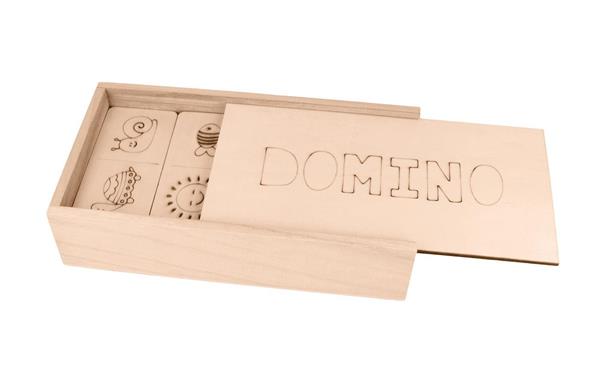 Domino van 24 houten kaartjes met tekeningen van schattige diertjes, zonnen, windmolens, enz... De kaartjes zitten in een houten opbergkistje met schuifdeksel.