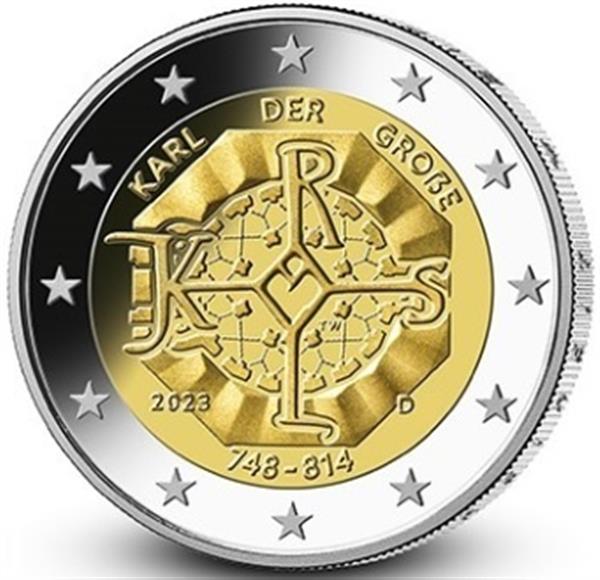 Duitsland 2 Euro 2023 'Karel de Grote'. Duitsland heeft een 2 Euromunt uitgegeven met als thema: Karel de Grote. Karel de Grote werd 1275 jaar geleden geboren, in het jaar 748. Hij werd op 21 jarige leeftijd koning der Franken en werd in het jaar 800 keizer van het Heilige Roomse Rijk. Hij wordt gezien als een van de belangrijkste heersers die West-Europa ooit gekend heeft. Karel de Grote wist als geen ander hoe belangrijk het was om West-Europe samen te voegen tot één grote natie, waarbij de huidige Europese-Unie in zijn voetsporen treedt. Op de voorkant van de munt ziet men twee picturale elementen die worden samengevoegd, namelijk het persoonlijke monogram van Karel de Grote en de achthoek van de Dom van Aken. Deze beide motieven smelten samen in het ontwerp van deze prachtige Duitse 2 Euro 2023 'Karel de Grote'. Verder wordt zijn naam Karl der Große (Karel de Grote) weergegeven en het jaartal van uitgifte, 2023. De munt is verpakt in een bedrukte munthouder. Bij Eurocoinhouse kunt u allerlei verschillende soorten euromunten kopen, maar ook accessoires, sets en bijzondere uitgaves van herdenkingsmunten.