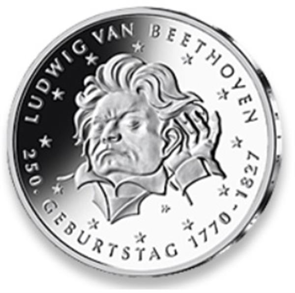 Ludwig van Beethoven was een Duitse componist, dirigent en musicus. Ludwig van Beethoven is een van de bekendste componisten die ooit geleefd heeft. Zijn werk: Für Elise (voor Elise) is een van zijn bekendste werken. Zijn werken hebben grote invloeden gehad in de negentiende-eeuwse muziek. Op elfjarige leeftijd schreef Ludwig van Beethoven zijn eerste composities waarbij zijn eerste werk in 1792 verscheen: de Dressler-Variationen. Beethoven vertrok voor korte duur richting Wenen in 1787 waarbij hij les nam bij eveneens een magnifiek componist, Mozart. Het is 250 jaar geleden dat Ludwig van Beethoven geboren werd, vandaar dat Duitsland besloten heeft om hier een 20 Euromunt over uit te geven. Op de voorkant van de munt ziet men een afbeelding van Ludwig van Beethoven. In cirkelvorm is geschreven: Ludwig van Beethoven en 250e Geburtstag 1770 - 1827. Op de achterkant van de munt staat de tekst: Bundesrepublik Deutschland (Bondsrepubliek Duitsland) en wordt de waarde aanduiding van 20 Euro weergegeven. De bekende adelaar staat gecentreerd in het midden. De munt is gemaakt van Sterling Zilver (Ag 925) dit ziet men onder de adelaar staan (silber 925). De munt is verpakt in een bedrukte munthouder. Bij Eurocoinhouse kunt u allerlei verschillende soorten euromunten kopen, maar ook accessoires, sets en bijzondere uitgaves van herdenkingsmunten.