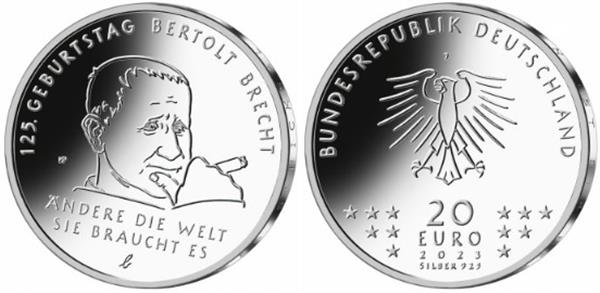 Duitsland 20 Euro 2023 'Bertolt Brecht'. Bertolt Brecht was één van de meest bekende Duitse schrijvers / dichters. Hij schreef zowel gedichten als romans maar heeft in zijn carrière ook vele filmscripts geschreven. Hij werd geboren in 1898 in Augsburg. Zijn grootste internationale succes was het opera stuk dat hij schreef: Dreigroschenoper. Hij was een communistische sympathisant en omdat hij in Duitsland gezocht werd, moest hij in 1933 vluchten naar het buitenland en woonde hierdoor onder andere in Denemarken, Finland, Zweden en de Verenigde Staten. Op de voorkant van de munt ziet men een afbeelding van Bertolt Brecht en ziet mijn zijn bekendste uitspraak: ÄNDERE DIE WELT SIE BRAUCHT ES (verander de wereld, hij heeft het nodig). Op de achterkant van de munt staat de tekst: Bundesrepublik Deutschland (Bondsrepubliek Duitsland), wordt de waardeaanduiding van 20 Euro weergegeven en ziet men het jaartal van uitgifte, 2023. De bekende adelaar staat gecentreerd in het midden. De munt is verpakt in een bedrukte munthouder. Bij Eurocoinhouse kunt u allerlei verschillende soorten euromunten kopen, maar ook accessoires, sets en bijzondere uitgaves van herdenkingsmunten.