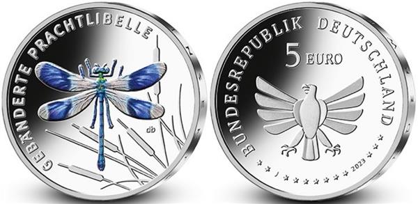 Duitsland 5 Euro 2023 'Libelle'. Duitsland heeft een 5 Euromunt uitgegeven met als thema de: Weidebeekjuffer, beter bekend als de Libelle. Deze Duitse 5 Euro maakt deel uit van een nieuwe serie 5 Euromunten met als thema: 'De wonderschone wereld van de insecten'. Deze serie bestaat in totaal uit 9 verschillende munten waarvan dit de vijfde is. Het insectenrijk is van cruciaal belang voor de aarde. Zonder insecten overleven we niet en zou er binnen een jaar of 10 - 20 een wereldwijde ecologische armageddon plaatsvinden. Insecten zorgen voor bestuiving van planten, bloemen en gewassen. Bijen leveren een grote bijdrage aan ons ecosysteem, iets waar we nauwelijks bij stil staan. Bijna 80% van de bestuiving van gewassen gebeurt door bijen en hommels! Tijdens deze bestuiving worden stuifmeelkorrels uit de helmhokjes overgedragen aan de stempel van de stamper, waardoor planten vruchten en zaden kunnen ontwikkelen. Op de voorkant van deze munt ziet men een afbeelding van de Libbele en wordt zijn naam in het Duits: GEBÄNDERTE PRACHTLIBELLE weergegeven. Op de achterkant van de munt staat de tekst: Bundesrepublik Deutschland (Bondsrepubliek Duitsland), wordt de waarde aanduiding van 5 Euro weergegeven en ziet men het jaartal van uitgifte, 2023. De bekende adelaar staat gecentreerd in het midden. De munt is verpakt in een bedrukte munthouder. Bij Eurocoinhouse kunt u allerlei verschillende soorten euromunten kopen, maar ook accessoires, sets en bijzondere uitgaves van herdenkingsmunten.