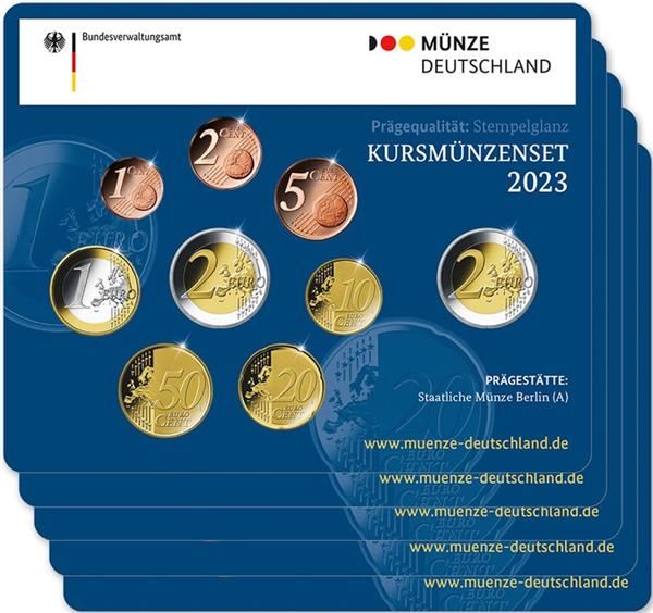 Dit is de BU set van Duitsland 2023. In de BU set van Duitsland 2023 is de complete serie Euromunten van Duitsland 2023 verpakt = 1 cent 2023 tot en met de normale 2 Euro 2023. Als extra munten zijn de bijzondere 2 Euromunten 2023 'Hamburg' in de sets verpakt. De BU set Duitsland 2023 bestaat uit vijf verschillende sets. In elke set zijn de munten van een slagplaats verpakt. De Duitse munten worden op vijf verschillende plaatsen geslagen: A = Berlijn, D = München, F = Stuttgart, G = Karlsruhe en J = Hamburg. In totaal bestaat de BU set Duitsland 2023 uit maar liefst 45 verschillende munten! De kwaliteit van de munten is BU (Briljant Uncirculated). De munten van deze vijf muntensets zijn verpakt in een mooie luxe blauwe verpakking. Bij Eurocoinhouse kunt u allerlei verschillende soorten euromunten kopen, maar ook accessoires, sets en bijzondere uitgaves van herdenkingsmunten.