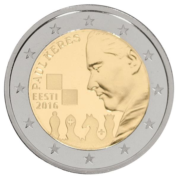 Op 7 januari 1916 is de beroemde Estse schaker Paul Keres geboren. Ter herinnering aan deze 100e geboortedag heeft Estland een bijzondere 2 Euromunt 2016 Paul Keres uitgegeven. Paul Keres was één van de grootste schakers aller tijden. Vanaf het jaar 1950 was hij Grootmeester. Omdat Rusland lang Estland bezet heeft, kwam Paul Keres als schaker voor Rusland uit. Paul Keres werd de enige tweede genoemd omdat hij nooit Wereldkampioen is geworden. In het jaar 1975 overleed Paul Keres plotseling aan een hartstilstand. Op de munt ziet men Paul Keres denkend en kijkend naar een schaakbord. Onderaan de munt ziet men enkele schaakstukken zoals de Koning, de Koningen, het Paard en de loper. Deze schaakstukken ziet men ook heel mooi op de kop weergegeven om beide kanten van het schaakbord te symboliseren. Links boven aan de munt ziet men de tekst Paul Keres. Aan de linkerkant van de munt ziet men de landsnaam EESTI (Estland) en het jaartal 2016. De kwaliteit van de munt is UNC (Uncirculated) en de oplage van deze munt in de kwaliteit UNC is 495.000 exemplaren. Bij Eurocoinhouse kunt u allerlei verschillende soorten euromunten kopen, maar ook accessoires, sets en bijzondere uitgaves van herdenkingsmunten.