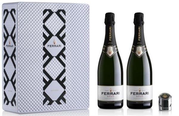 - Ferrari, Witte Metalen Gift box + 2 flessen Brut + Ferrari Stopper