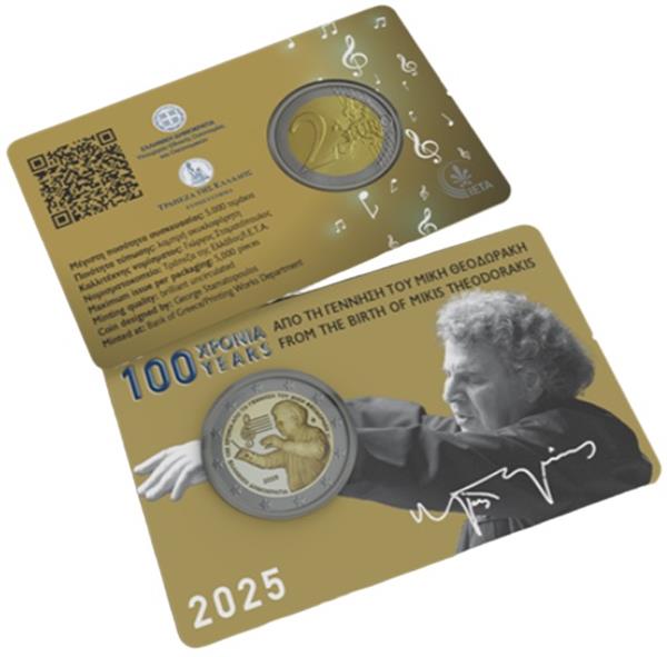 Griekenland 2 Euro 2025 'Mikis Theodorakis' Coincard. Griekenland heeft een bijzondere 2 Euromunt uitgegeven met als thema: 'Mikis Theodorakis'. 'Mikis Theodorakis' was een Griekse componist, dirigent en eveneens politicus. Hij werd geboren in het jaar 1925 in de Griekse hoofdstad: Athene. Op zijn zeventiende levensjaar vormde hij een koor en gaf hij al zijn eerste concert! Hij studeerde aan het conservatorium in Athene en later in het conservatorium van Parijs. Hij wordt hedendaags gezien als één van de beste componisten die Griekenland ooit gekend heeft. In de Tweede Wereldoorlog was hij actief in het Griekse verzet en werd hij gevangengenomen en gemarteld. Na de Griekse Staatsgreep in 1967 werd hij verbannen uit Griekenland en was het verboden zijn muziek te draaien. Echter gaf 'Mikis Theodorakis' nooit op! Uiteindelijk kwam hij na het kolonelsregime in 1974 terug naar Griekenland en werd hij zelfs minister in de regering van Konstantinos Mitsotakis! Op de voorkant van de munt ziet men 'Mikis Theodorakis' met zijn baton in zijn handen. Verder wordt zijn naam in het Griekse weergegeven en ziet men het jaartal van uitgifte, 2025. De munt is verpakt in een schitterende Coincard waarvan de oplage 5.000 exemplaren is! Bij Eurocoinhouse kunt u allerlei verschillende soorten euromunten kopen, maar ook accessoires, sets en bijzondere uitgaves van herdenkingsmunten.