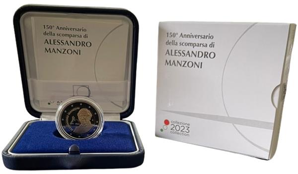 Italië 2 Euro 2023 'Alessandro Manzoni' Proof. Italië heeft een bijzondere 2 Euromunt uitgegeven in 2023 met als thema: Alessandro Francesco Tomasso Manzoni (Alessandro Manzoni). Alessandro Manzoni was een Italiaanse Romanschrijver, geboren in het jaar 1785 te Milaan. Hij vertrekt op 20 jarige leeftijd naar Parijs, daar waar zijn passie voor Romans toenam. Zijn Roman: I Promessi Sposi wordt gezien als één van de grootste meesterwerken uit de Wereldliteratuur. Op de voorkant van de munt ziet men een afbeelding van Alessandro Manzoni en wordt zijn naam weergegeven. Verder wordt zijn overlijdensjaar (1873) en het jaartal van uitgifte (2023) weergegeven. Deze 2 Euro 2023 (Alessandro Manzoni) Proof was binnen een dag compleet uitverkocht. De munt is verpakt in een schitterende Cassette en wordt met een echtheidscertificaat geleverd. Bij Eurocoinhouse kunt u allerlei verschillende soorten euromunten kopen, maar ook accessoires, sets en bijzondere uitgaves van herdenkingsmunten.