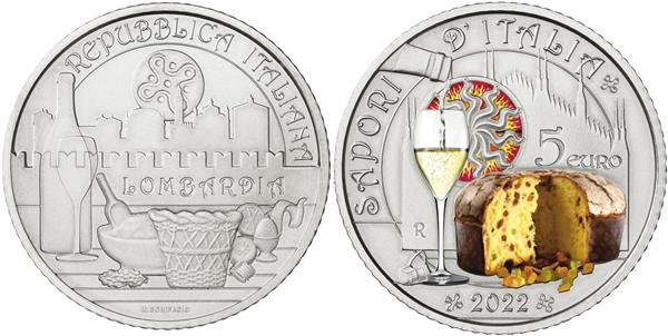 Italië 5 Euro 2022 'Lombardije - Franciacorta en Panettone. Italië geeft een serie 5 Euromunten uit met als thema; Italiaans eten en wijn. Dit is de vierde munt uit deze serie. Panettone is een Luxe Italiaanse brood, gevuld met rozijnen en gekonfijt fruit. Het komt van origine uit Milaan en heeft een luchtig structuur en wordt altijd gebakken en een typisch ronde vorm. Franciacorta is een mousserende wijn die wel wat weg heeft van een champagne. Het komt uit de streek: Lombardije dat ligt tussen Verona en Milaan. Franciacorta wordt voornamelijk gemaakt van de druif: Pinot Bianco. Op de voorkant van de munt ziet men een afbeelding van de Panettone en Franciacorta. Ook wordt het jaartal van uitgifte, 2022 en de waardeaanduiding van 5 Euro weergegeven. Op de achterkant van de munt ziet men de ingrediënten voor een Panettone: Ei, citroen, meel, gekonfijte citroen, rozijnen, boter en sinaasappelschil. Verder ziet men een fles Franciacorta in een bak met ijs liggen. Verder ziet men de landsnaam: REPUBBLICA ITALIANA (Italië). De munt is verpakt in een schitterende Coincard die vervolgens weer verpakt is een in schitterende blister. Bij Eurocoinhouse kunt u allerlei verschillende soorten euromunten kopen, maar ook accessoires, sets en bijzondere uitgaves van herdenkingsmunten.