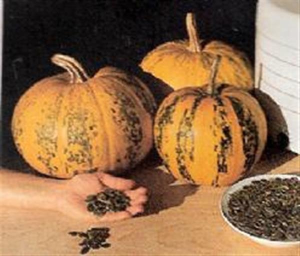 Oostenrijkse selectie, 2-4 kg, helder oranje met Groen -zwarte strepen, bevatten talrijke vliesloze zaden, om te roosteren of te bakken, het vruchtvlees is prima voor soep. Decoflorall.nl