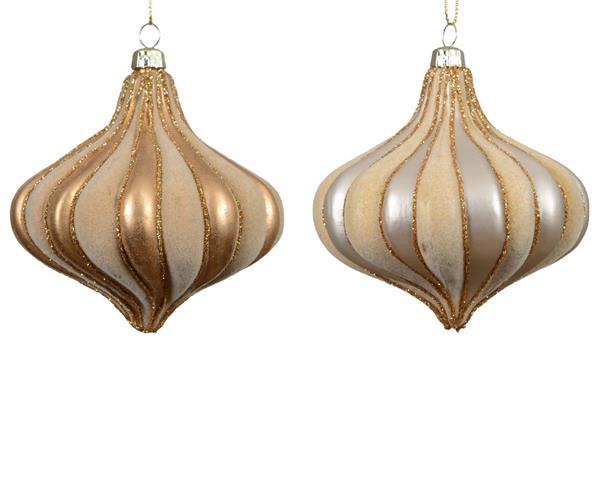 Onbreekbare kerstballen in elegante druppelvorm met luxe Flock-afwerking Set van 2 stuks in warm goud en zachte beige tinten Perfect als hanger in een kerstkrans of verwerkt in onze bloemstukhouder Mooie combinatie van fluweelzacht oppervlak en metallic accenten Lichtgewicht en voorzien van ophangoog – klaar om op te hangen