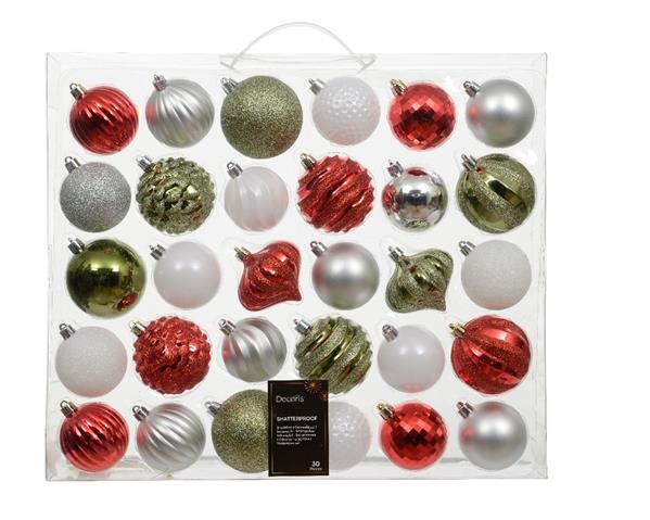 Kerstballen en ornamenten 7 cm Rood Wit Groen mix onbreekbaar doos 30 stuks