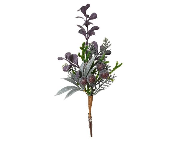 Kersthanger van ca. 22 cm met diverse soorten wintergroen, donker blad en besjes met fijne glitter Voorzien van metalen clip – toepasbaar in bloemstukken voor kerst of winter Te verwerken in een toef of als winterse corsage Voor gebruik als corsage kan de clip beter anders bevestigd worden, of vervangbaar door corsagespeldje of corsagemagneetje Warme paars-groene tinten geven een eigentijdse sfeer aan natuurlijke kerstdecoratie