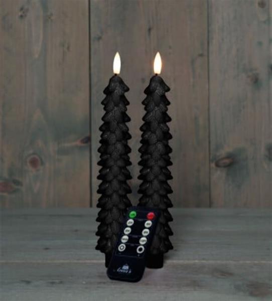 LEDkaarsen Anna's Collection LED kaars 3D Flame Candle Rustiek Zwart met afstandsbediening D 2,5 H 23 cm /2 stuks Deze set van 2 dinerkaarsen in de vorm van een kerstboom is perfect voor het creëren van een gezellige sfeer tijdens de feestdagen. De kaarsen zijn gemaakt van wax en hebben een realistische 3D vlam die op LED-verlichting werkt. Hierdoor zijn ze veilig in gebruik en kunnen ze worden bediend met de bijgeleverde afstandsbediening. Met een hoogte van 23 cm zijn deze kaarsen een prachtige toevoeging aan je kerstdecoratie. De kaarsen zijn uitgevoerd in een stijlvolle zwarte kleur en worden geleverd exclusief batterijen. Voeg een vleugje magie toe aan je kersttafel of interieur met deze sfeervolle dinerkaarsen in de vorm van kerstbomen. Perfect voor een warme en feestelijke ambiance tijdens de feestdagen. Het betreft 2 stuks van 23 cm. Let op: Niet elke oplaadbare batterij past in deze dinerkaars. Wij raden de batterijen van Varta aan. Batterij: 2*2AAA,