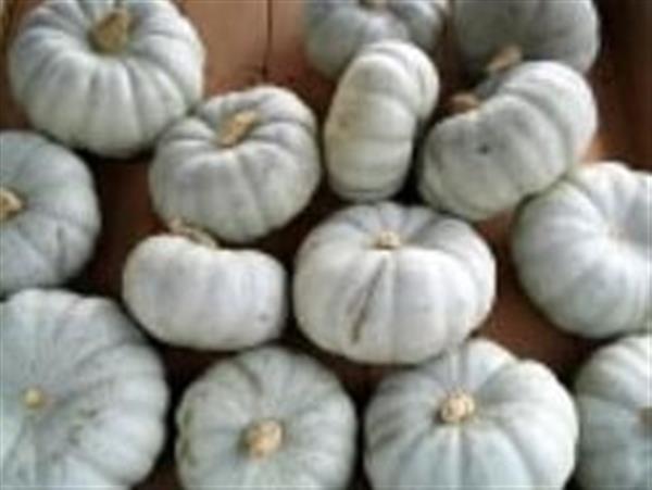 Een kleine blauwgrijze pompoen uit Thailand 1- 1, 5 kg platrond +/- 15 cm, licht geribd, oranje vruchtvlees, voor soep, jam, bakken enz. (6 zaden) Decoflorall.nl