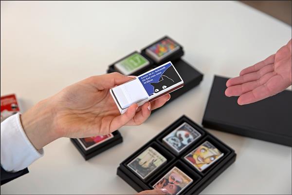 Unieke handgemaakte uitgave van een in harmonicavorm gevouwen kunstboekje verpakt in een luxe geschenkdoos.