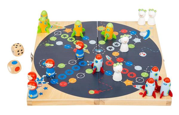 Mens Erger Je Niet in het thema de ruimte. De droom van jonge astronauten wordt met dit spel werkelijkheid. Hier bewegen ruimtepiloten, vliegende raketten en zwervende aliens overal rond. Wie als eerste zijn sterrenveld bedekt is gewonnen. Het spelbord dient ook als handige opbergdoos en kan makkelijk worden vervoerd.