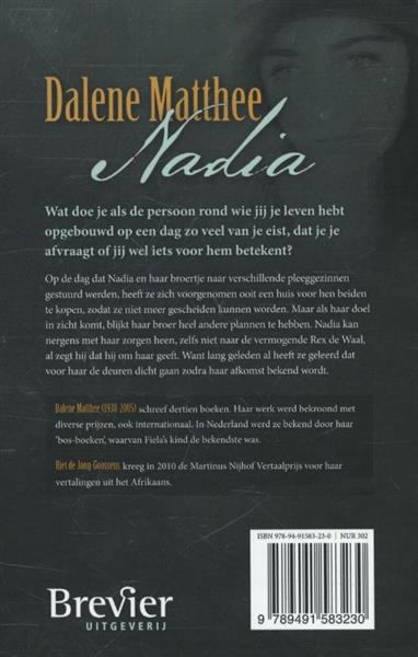 Titel: Nadia Auteur: Dalene Matthee ISBN: 9789491583230 Conditie: Used Wat doe je als de persoon rond wie jij je leven hebt opgebouwd op een dag zo veel van je eist, dat je je afvraagt of jij wel iets voor hem betekent? Nadia Haman, uit huis geplaatst kind, verschoppeling. Op de dag dat zij en haar broertje in verschillende pleeggezinnen geplaatst werden, heeft ze zich voorgenomen op een dag een huis voor hen beiden te kopen, zodat ze niet meer gescheiden kunnen worden. Maar als haar doel in zicht komt, blijkt haar broer heel andere plannen te hebben. Nadia kan nergens met haar zorgen heen, zelfs niet naar de rijke Rex de Waal, al zegt hij dat hij om haar geeft. Want lang geleden al heeft ze geleerd dat voor haar de deuren dicht gaan zodra haar afkomst bekend wordt.