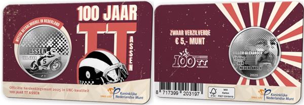 Nederland 5 Euro 2025 'TT Assen' Coincard UNC. Nederland heeft een bijzondere 5 Euromunt uitgegeven met als thema: TT Assen. Het TT Circuit in Assen is een Nederlands circuit, waaronder de MotoGP, WK Superbike en DTM worden gehouden. Er wordt al sinds 1925 geracet in Assen, het huidige circuit ligt er al sinds 1955! Het circuit was oorspronkelijk 7705 meter lang maar hedendaags nog slechts 4555 meter. De bekendste bochten zijn: de Haarbocht, Madijk, Strubben en Ossebroeken. Het langste rechte stuk is maar liefst 970 meter, waar snelheden ver boven de 300 kilometer worden gehaald. Naast enkel Racewedstrijden worden er ook andere evenementen gehouden, honderden per jaar! Omdat de eerste race 100 jaar geleden werd gehouden, heeft de Koninklijke Nederlandse Munt deze bijzondere 5 Euromunt: TT Assen geslagen. Op de voorkant van de munt ziet men een motorcoureur scheuren op zijn motor. Verder ziet men staan: TT Assen 100 Jaar en wordt de waardeaanduiding van 5 Euro weergegeven. Op de achterkant van de munt ziet men een portret van Willem Alexander en wordt zijn naam: WILLEM ALEXANDER KONING DER NEDERLANDEN weergegeven. Tot slot ziet men het jaartal van uitgifte, 2025. Deze bijzondere 5 Euromunt: TT Assen is verpakt in een schitterende Coincard. Bij Eurocoinhouse kunt u allerlei verschillende soorten euromunten kopen, maar ook accessoires, sets en bijzondere uitgaves van herdenkingsmunten.