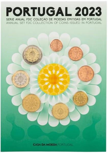 Dit is de FDC set van Portugal 2023. De Portugese FDC set 2023 bevat alle 8 nominaties. Dit wil zeggen de Portugese 1 cent 2023 tot en met de normale 2 Euro van Portugal 2023. De afbeeldingen op de Portugese munten zijn gebaseerd op oeroude Koninklijke zegels van Dom Afonso Henriques. Op de 1 cent + 2 cent + 5 cent ziet men het Koninklijk zegel uit het jaar 1134. Op de 10 cent + 20 cent + 50 cent ziet men het Koninklijk zegel uit het jaar 1143 en op de 1 Euro en de 2 Euro het Koninklijk zegel uit het jaar 1144. In een cirkel ziet men de vijf wapenborden en de zeven kastelen uit het Wapen van Portugal. Tussen deze wapenborden en kastelen ziet men de landsnaam Portugal en het jaartal 2023. In de buitenste ring van de munten ziet men de 12 sterren van Europa. Diverse munten van Portugal 2023 zullen niet in circulatie komen! Bij Eurocoinhouse kunt u allerlei verschillende soorten euromunten kopen, maar ook accessoires, sets en bijzondere uitgaves van herdenkingsmunten.