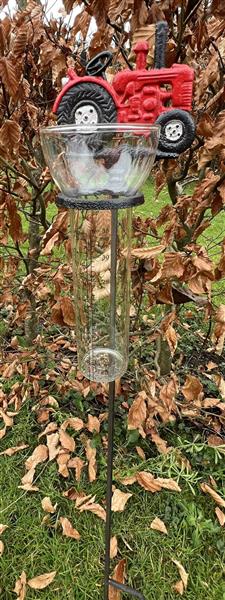 Decoratieve gietijzeren regenmeter met afbeelding van rode tractor, trekker.
