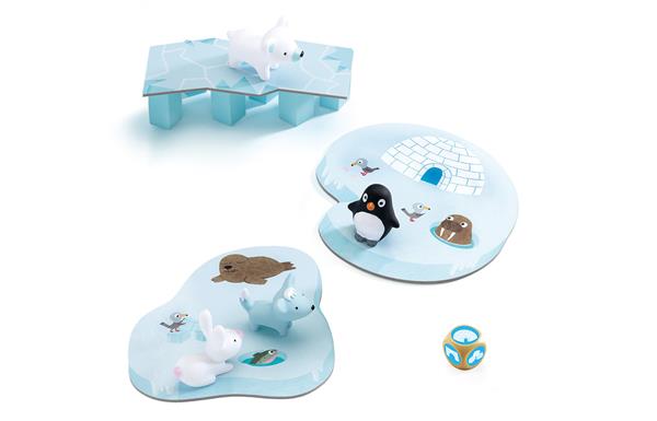 Met dit spel leren kinderen samenwerken, ze helpen de pooldieren over de brug om terug bij de iglo te geraken. Gooi met de dobbelsteen en kijk welke zet je mag doen. Let op: als er een pilaar opstaat moet je 1 van de steunpilaren van de brug wegnemen! Probeer alle dieren aan de overkant te krijgen voor de brug instort!