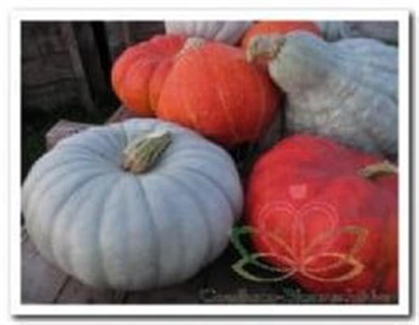 Grijze rankende pompoen heeft veel ruimte nodig, 3-4 m2, heerlijk zoet donkeroranje vruchtvlees, 28 x 16 cm.Gewicht 5 - 7 kg. 5 zaden. Links onder op foto, verwant aan Crown Prince F1 . (5 zaden) Decoflorall.nl