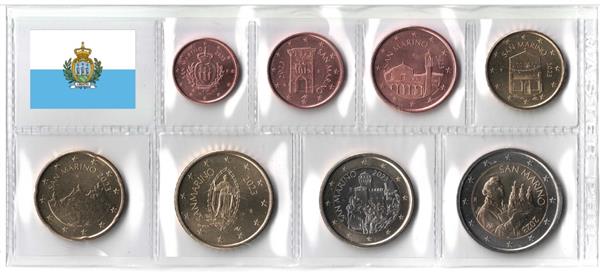 San Marino UNC 2023. Dit is de complete serie Euromunten van San Marino 2023. Op de 1 cent munt ziet men het wapen van San Marino. Op de 2 cent munt ziet men de Stadspoort en op de 5 cent munt ziet men de Kapucijnderkerk San Quirino. Op de 10 cent munt ziet men de facade van de kerk van Sint Francis en op de 20 cent munt ziet men de drie beroemde torens van San Marino. Op de 50 cent munt ziet men Sint Marino conform een detail van het schilderij van de schilder Retrosi. Op de 1 Euromunt ziet men de tweede toren, de middelste van drie beroemde torens. Op de 2 Euromunt ziet men wederom een afbeelding van Sint Marino, dit als een detail van een schilderij van de schilder Urbinelli. De complete set van San Marino 2023 bestaat dus uit alle 8 munten. Bij Eurocoinhouse kunt u allerlei verschillende soorten euromunten kopen, maar ook accessoires, sets en bijzondere uitgaves van herdenkingsmunten.