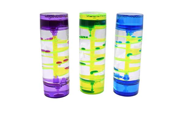 Kristalheldere sensorische vloeistofset met kleurrijke olie en water. Wanneer ze ondersteboven worden gedraaid, rolt de gekleurde vloeistof in een spiraal naar de onderkant van de zandloper. Alle materialen die worden gebruikt in de fabrikant van de sensorische vloeibare producten vallen binnen de toelaatbare limieten die zijn vastgelegd door de Europese voorschriften voor classificatie, etikettering en verpakking (CLP 2008). De zandloper heeft een duurtijd van ongeveer 9 minuten. Er wordt een willekeurige kleur aangeboden.