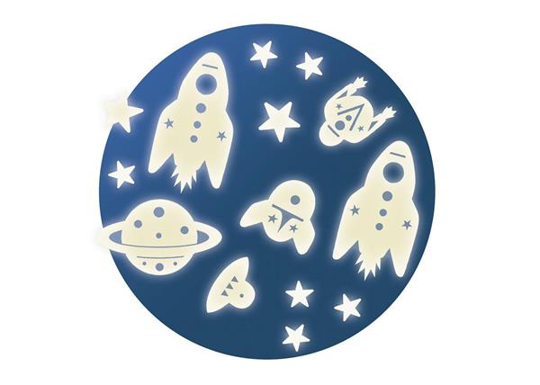 Deze stickers kunnen aan het raam, muur en plafond bevestigd worden. Ze laden op in het licht en schijnen in het donker. Deze set bevat 62 stickers in het thema ruimte (sterren, planeet, raket, ufo,...). De dubbelzijdige tape is ook inbegrepen.