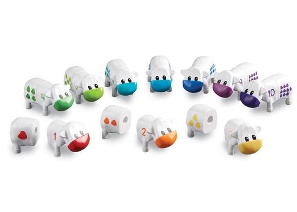 Zeer leuke tweedelige plastic koeien om het tellen van jongs af aan onder de knie te krijgen. De koeien zijn op hun kop bedrukt met het getal en op de buik het getalbeeld. Er kan gecombineerd worden op zowel kleur als getal/getalbeeld. Door het in elkaar klikken van de delen worden ook de fijnmotorische vaardigheden verder gestimuleerd. De set wordt geleverd in een handige opbergemmer.
