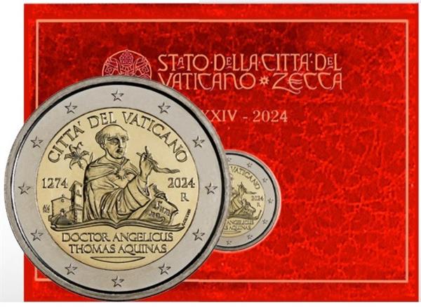 Vaticaan 2 Euro 2024 'Thomas van Aquino'. Vaticaan heeft zijn eerste bijzondere 2 Euromunt uitgegeven in 2024 met als thema: Thomas van Aquino. Thomas van Aquino was een Italiaanse doctor, theoloog en filosoof. Hij stond bekend om zijn systematische denkwijze en zijn werken werden eeuwenlang door de Katholieke kerk gebruikt. Hij werd geboren in het kasteel Roccasecca en verspreide zijn werken in onder andere Parijs, Keulen, Napels en Rome. Hij werd in 1323 heilig verklaard door Paus Johannes XXII. Thomas van Aquino behoorde tot de Dominicaanse Orde, iets wat zijn familie nooit geaccepteerd heeft. Op de voorkant van de munt ziet men Thomas van Aquino, gekleed in een habijt. In zijn linkerhand houdt hij een boekdeel vast van zijn belangrijkste werk: Summa Theologica, een boekwerk dat hij nooit heeft afgemaakt! Verder ziet men de landsnaam: CITTA DEL VATICANO (Vaticaan) en het jaartal van uitgifte, 2024. De munt is verpakt in een schitterende bordeauxrode verpakking. Bij Eurocoinhouse kunt u allerlei verschillende soorten euromunten kopen, maar ook accessoires, sets en bijzondere uitgaves van herdenkingsmunten.