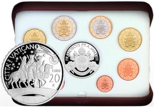 Dit is de Proofset Vaticaan 2023 + 20 Euro Zilver. In deze set zijn negen munten verpakt. Deze zijn de complete serie Euromunten van het Vaticaan 2023 en als extra munt de 20 Euro 2023 in Zilver. Vanaf de introductie van de Euro in het jaar 2002 werd de Paus op de Euromunten van het Vaticaan afgebeeld. De huidige Paus Franciscus I heeft in zijn eenvoud besloten dat zijn afbeelding niet meer op de munten van het Vaticaan hoeft. Zijn afbeelding is met ingang van het jaar 2017 vervangen door het Pauselijk Wapen. Het Pauselijk Wapen is een Wapenschild dat hij al sinds 1991 gebruikt toen hij aantrad als Bisschop van Argentinië. Aan de bovenkant van het wapen ziet men een mijter met de twee sleutels van Petrus. Gecentreerd in het midden ziet men de letters IHS van Christus met daarboven een kruis. Verder ziet men ook drie zwarte nagels. De ster verwijst naar Maria en het gras verwijst naar Jozef. Aan de onderkant van het wapen ziet men de wapenspreuk van de Paus. Deze wapenspreuk is miserando atque eligendo (gekozen door genade). Deze afbeelding ziet men op de munten van 1 cent 2023 tot en met 2 Euro 2023. Verder ziet men de tekst Citta del Vaticano op deze munten. Op de Zilveren 20 Euromunt ziet men de 3 Wijzen uit het Oosten, rijdend op 2 paarden en 1 kameel. Bij Eurocoinhouse kunt u allerlei verschillende soorten euromunten kopen, maar ook accessoires, sets en bijzondere uitgaves van herdenkingsmunten.