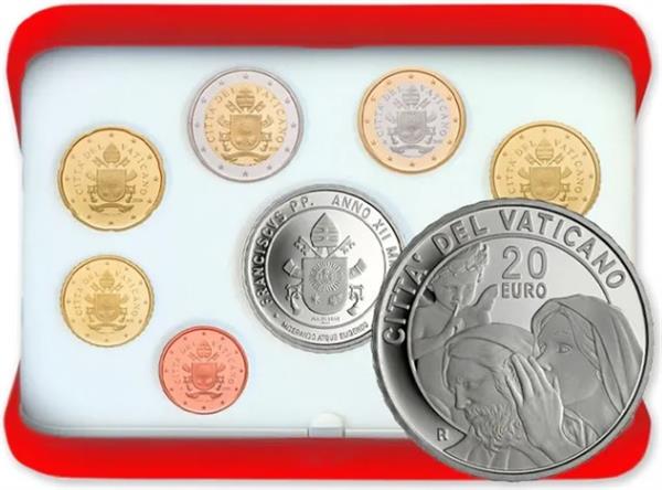 Dit is de Proofset Vaticaan 2024 + 20 Euro Zilver. In deze set zijn negen munten verpakt. Deze zijn de complete serie Euromunten van het Vaticaan 2024 en als extra munt de 20 Euro 2024 in Zilver. Vanaf de introductie van de Euro in het jaar 2002 werd de Paus op de Euromunten van het Vaticaan afgebeeld. De huidige Paus Franciscus I heeft in zijn eenvoud besloten dat zijn afbeelding niet meer op de munten van het Vaticaan hoeft. Zijn afbeelding is met ingang van het jaar 2017 vervangen door het Pauselijk Wapen. Het Pauselijk Wapen is een Wapenschild dat hij al sinds 1991 gebruikt toen hij aantrad als Bisschop van Argentinië. Aan de bovenkant van het wapen ziet men een mijter met de twee sleutels van Petrus. Gecentreerd in het midden ziet men de letters IHS van Christus met daarboven een kruis. Verder ziet men ook drie zwarte nagels. De ster verwijst naar Maria en het gras verwijst naar Jozef. Aan de onderkant van het wapen ziet men de wapenspreuk van de Paus. Deze wapenspreuk is miserando atque eligendo (gekozen door genade). Deze afbeelding ziet men op de munten van 1 cent 2024 tot en met 2 Euro 2024. Verder ziet men de tekst Citta del Vaticano op deze munten. Op de Zilveren 20 Euromunt ziet men een vrouw wat in een man zijn oren fluisteren met op de achtergrond een Engel. Bij Eurocoinhouse kunt u allerlei verschillende soorten euromunten kopen, maar ook accessoires, sets en bijzondere uitgaves van herdenkingsmunten.
