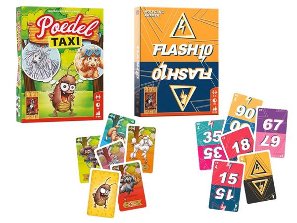Dit is een voordeelset van 2 kaartspellen: Poedel Taxi (6+) en Flash 10 (8+).