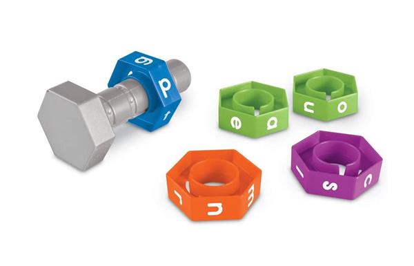Woorden maken is extra leuk met deze vrolijk gekleurde bouten en moeren! Begin met een medeklinker of een klinker en maak een woordje. De groene moeren bevatten de klinkers. Er kunnen maximaal 4 moeren op een bout geschoven worden dus de kinderen kunnen woorden maken van maximum 4 letters.